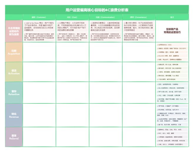 在正式进行调查之前,我已经心中有一套科学标准——即用于评价用户运营活动是否合理的依据。它是按照市场营销的4C理论来分类产品信息,并将行为学和心理学作为评估AARRR模型中每个阶段是否有资源浪费或不必要的操作的理论基础。