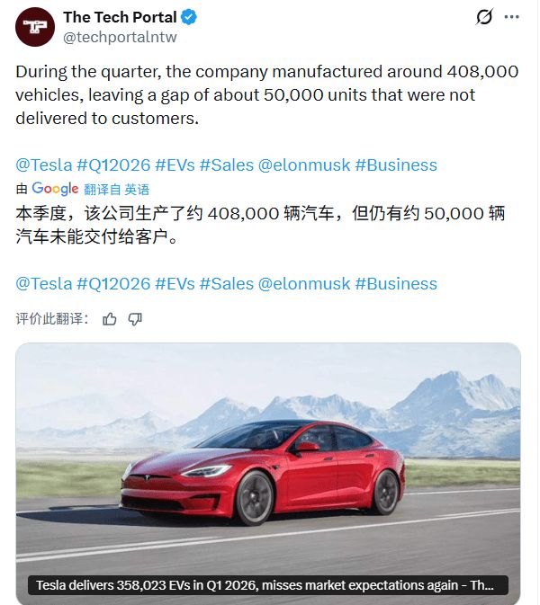 更让投资者担忧的是环比数据。与2025年第四季度的418227辆相比,今年第一季度交付量下滑了14%。彭博社指出,这是特斯拉自2022年中期(排除全球工厂停工期)以来最差的季度成绩,也是公司连续第二个季度未达到市场预期。