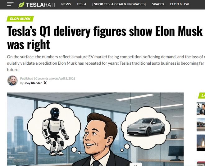 科技媒体Teslarati则在一篇名为《特斯拉第一季度交付数据显示马斯克是正确的》的报道中给出了不同的视角。文章认为,疲软的数据恰恰印证了马斯克此前的战略预判:传统电动车业务对特斯拉整体估值的核心驱动作用正在边缘化。