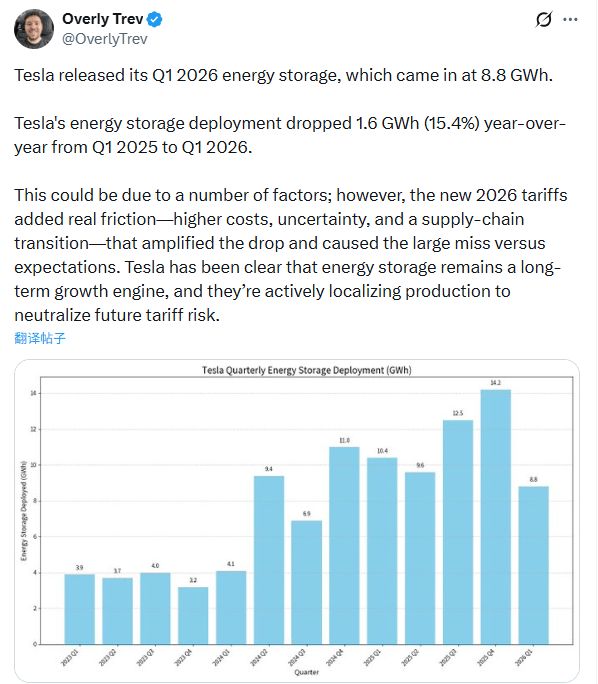 特斯拉的储能业务在过去几个季度一直是提振财报的亮点,但本季度情况出现了逆转。公司报告称,第一季度部署了8.8吉瓦时的电池储能产品,同比下降15.4%,更是远低于2025年第四季度创纪录的14.2吉瓦时。