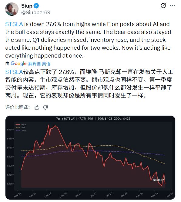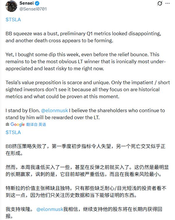 但市场中也不乏坚定的抄底者。有投资者表示,尽管第一季度指标疲软且技术面呈现下行趋势,但他依然选择在低位增持。该观点认为,特斯拉依然是最具确定性的长期赢家,目前的震荡反而是估值修复前的买入窗口。