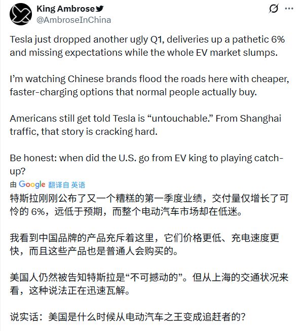 针对中国品牌的冲击,有评论一针见血地指出:中国本土车企在定价策略和充电技术上的迭代速度,更贴近大众消费者的真实需求。当部分市场还在固守特斯拉不可战胜的品牌滤镜时,一线市场的真实消费反馈早已说明了竞争格局的改变。