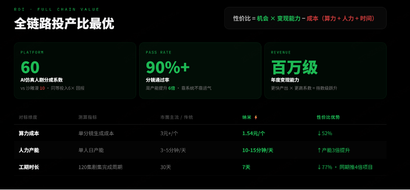 根据纳米漫剧流水线公开的数据,在三个关键指标上,该平台已经实现了行业领先:单个镜头生成成本为1.55元(相比之下,行业的平均值超过3元,降幅超过50%);十二集的动画系列可以在七天内完成制作(而传统方法需要三十天,缩短了77%的时间);在AI真人剧方面,平台分成系数达到了60(传统的沙雕漫画只有10),意味着相同的投入可以获得六倍的回报。