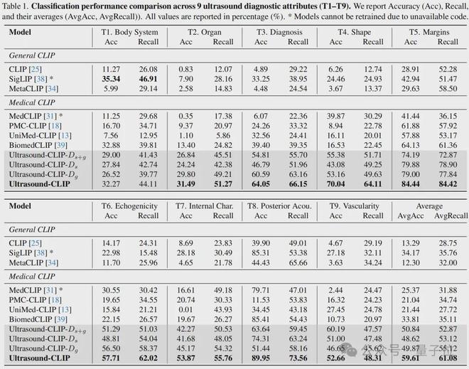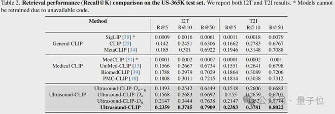 团队以US-365K为基础,在多任务分类、图像-文本检索任务中开展实验,并在4个公开的超声下游数据集上验证模型泛化能力,结果显示Ultrasound-CLIP全面优于现有医疗CLIP基线模型: