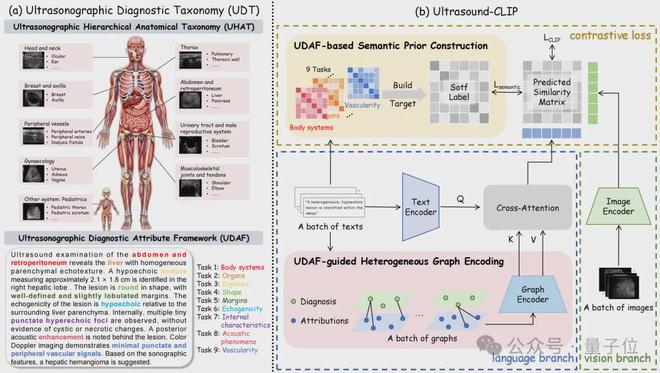 为了应对超声场景中的模糊语义和结构缺失问题,团队设计了一个创新的对比学习框架——Ultrasound-CLIP。该框架在传统的双编码器基础上引入了UDAF引导的异质图编码器和基于UDAF的语义软标签模块,并采用双目标优化策略。