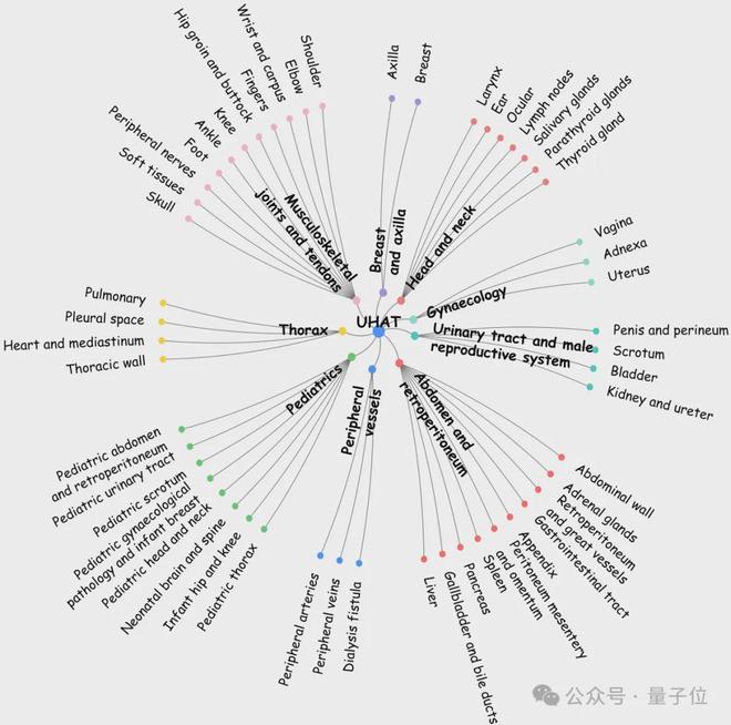 超声层级解剖分类(UHAT):通过梳理9大人体系统的52个器官及其层级关系,并明确了各个器官在不同层次中的归属及相互联系,解决了各种数据源中解剖学分类混乱的问题;