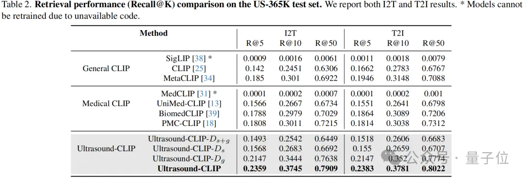 图像-文本检索:图像到文本检索(I2T)@10达37.45%,文本到图像检索(T2I)@50达80.22%,实现超声图文的高效双向匹配。