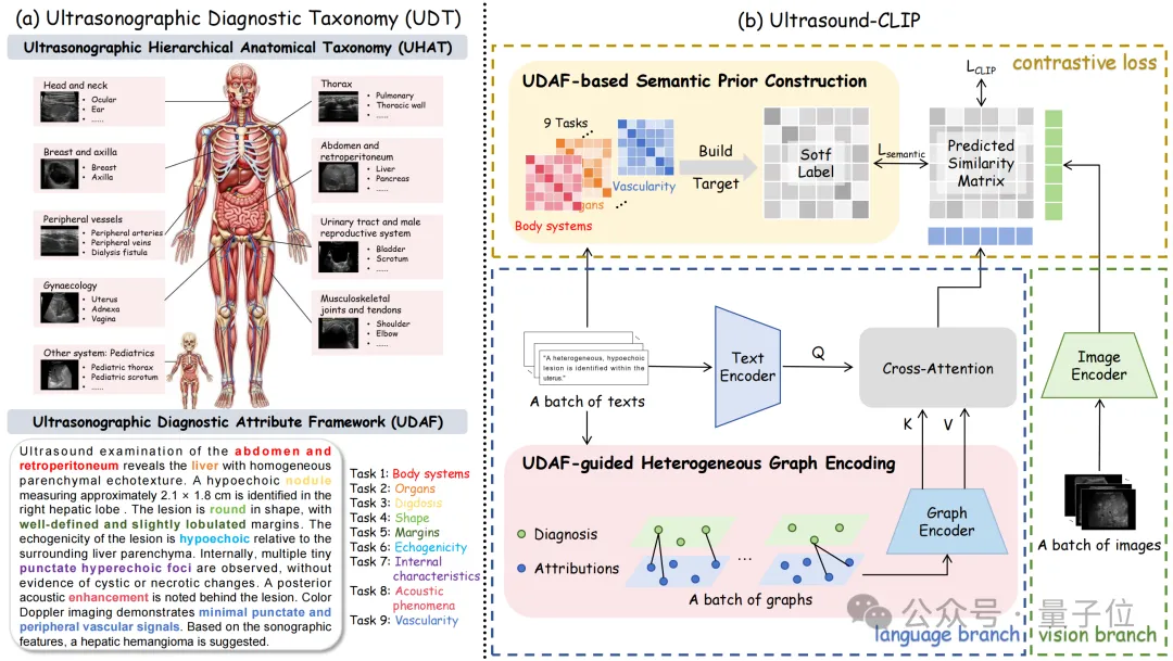 △UDT和Ultrasound-CLIP概述。超声层级解剖分类(UHAT):该模块详细描述了人体各系统及器官的层级关系,并明确了不同数据源间的解剖学差异,确立了超声图像标注的标准流程;