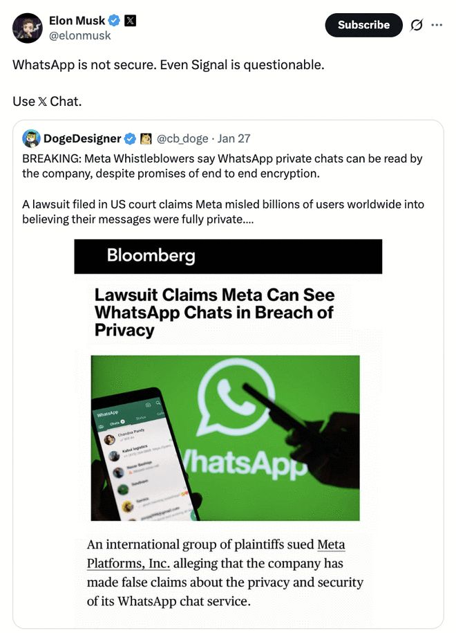 马斯克在今年早些时候就此事在X平台上发表评论,直言不讳地批评了Meta的不可信以及WhatsApp的安全性问题,并建议用户转向拥有真正隐私保护功能的XChat。