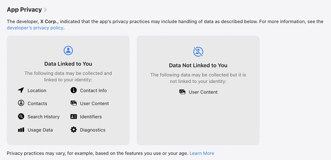 苹果应用商店的隐私政策页面明确列出XChat将收集用户的地理位置、联系信息以及搜索历史等数据。