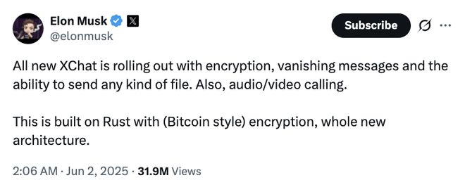 马斯克在推广XChat时频繁提及比特币式的加密方式。
