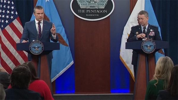 在新闻发布会上,赫格塞思和凯恩详细介绍了有关此次军事打击的情况(图/视频截图)