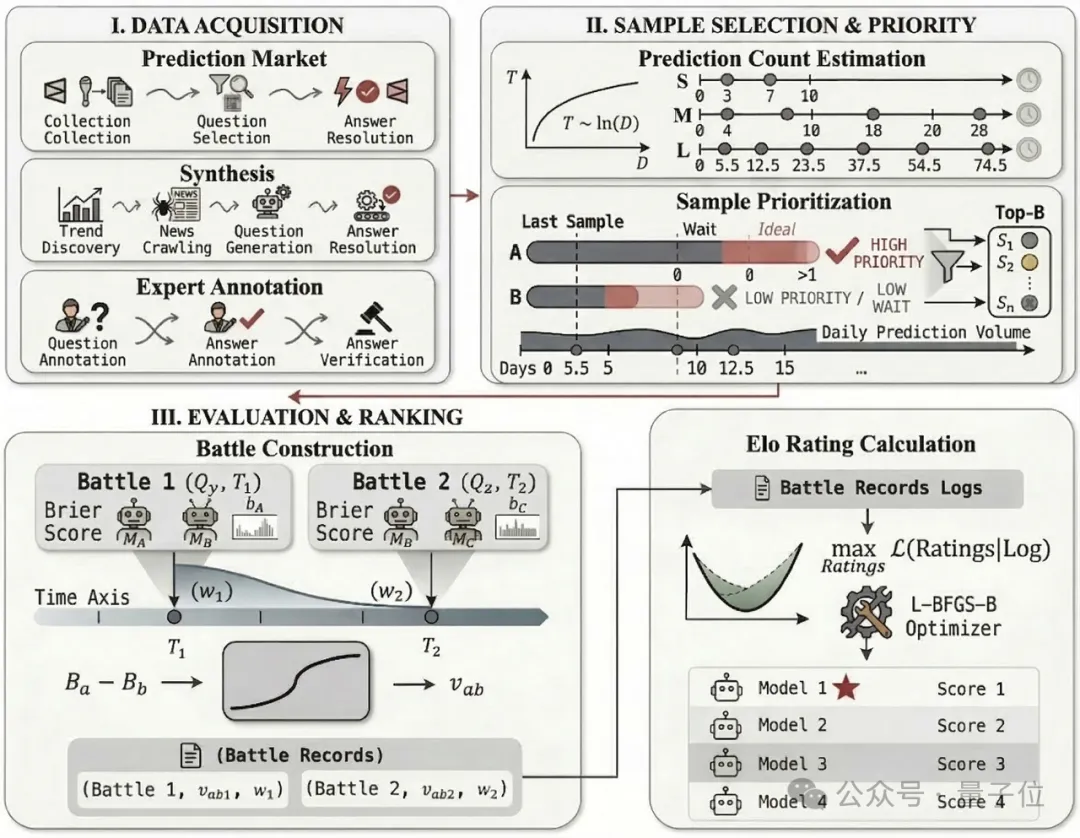 这是解决时序不对称问题的关键环节。评测使用point-aligned Elo机制:严格只比较“同一道题、同一预测时间点”的结果。所有参赛模型在完全相同的信息上下文下对决,公平性由此建立。