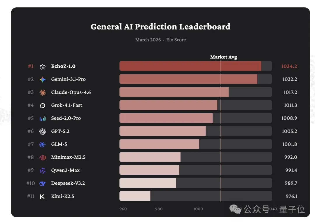在General AI Prediction Leaderboard上(2026年3月数据),EchoZ-1.0以Elo 1034.2排名第一,领先Google的 Gemini-3.1-Pro(1032.2)和Anthropic的Claude-Opus-4.6(1017.2)。排行榜涵盖12个模型,覆盖经济、体育、科技等7个领域,活跃题目超过1000道。