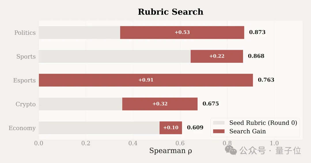 Echo把这个问题转化成了一个数据驱动的搜索任务:由LLM生成候选评分标准(rubric),每一轮基于上一轮的反馈进行迭代,搜索目标是让rubric产生的模型排名与真实Elo排名之间的Spearman ρ最大化。搜索按领域独立进行。实验数据显示,rubric的评估质量在迭代过程中持续攀升。