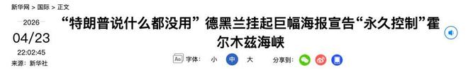 法新社报道指出,这张海报描绘了一个人手持装饰有伊朗国旗图案的袖子,紧紧抓住一条蓝色绸带的情景。这根绸带上的一端挤满了船只,而另一端则空无一物。海报上的文字用波斯语写道:“特朗普总统的话没有任何作用,霍尔木兹海峡将始终由伊朗掌控。”
