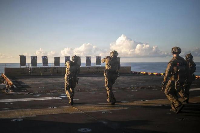 当地时间2026年3月20日,美国,美国海军第31远征部队的海军陆战队士兵在美利坚级两栖攻击舰“的黎波里”号(LHA 7)的飞行甲板上进行射击训练/图源:视觉中国