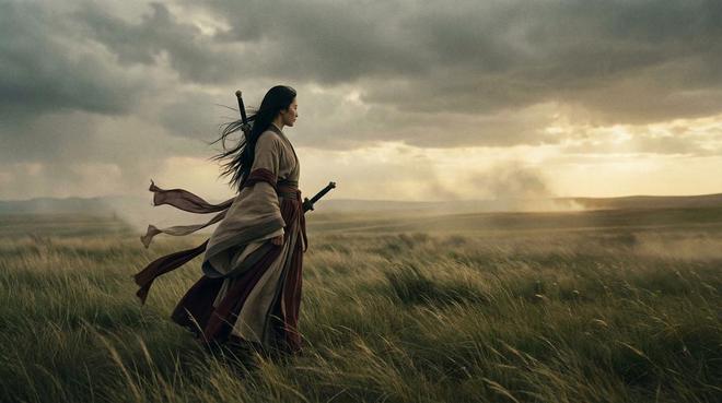 在实际体验中,当向Uni-1发出“生成一张宿命感照片,一个长发飘飘的女子身穿战国袍,配了把剑”的指令后,该模型会先用几秒钟分析需求,然后开始创作,大约花费5分钟完成。生成的画面具有电影感,长发和衣摆随风飘动,服饰质感丰富,虽然剑出现了两把,但整体上细节处理得相当细腻。