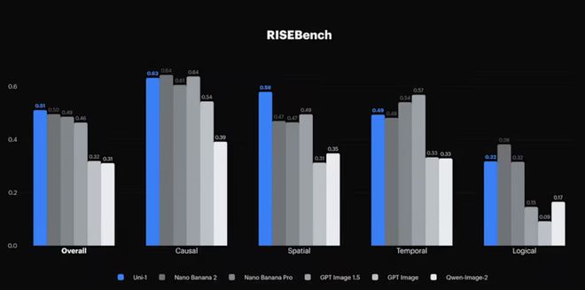 - 逻辑推理:Uni-1得分0.32,略次于Nano Banana 2(0.38),是GPT Image 1.5(0.15)和Qwen-Image-2(0.17)的两倍以上。