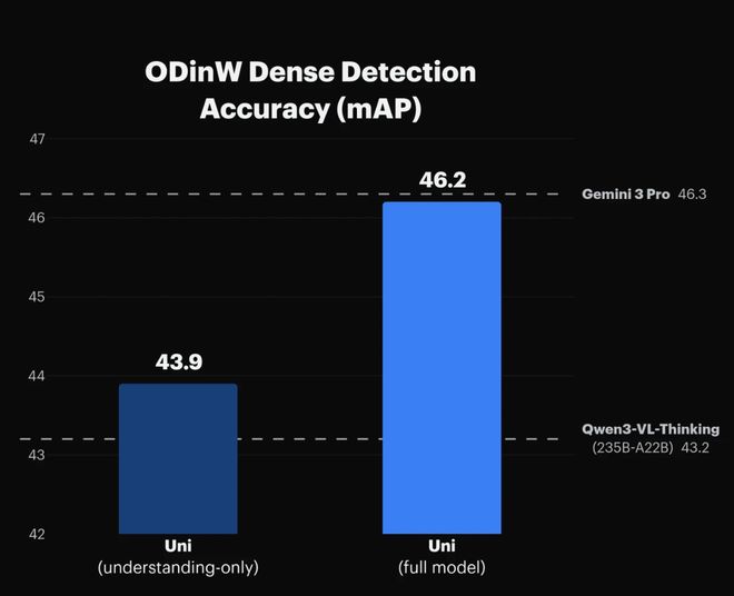 在ODinW-13物体检测基准测试中,Uni-1完整版得分为46.2 mAP,几乎与谷歌Gemini 3 Pro的46.3持平,而Qwen3-VL-Thinking得分为43.2。值得注意的是,Uni-1在未经生成训练的情况下已经达到了43.9的得分,这表明生成图像的能力可以提升模型的图像理解能力。