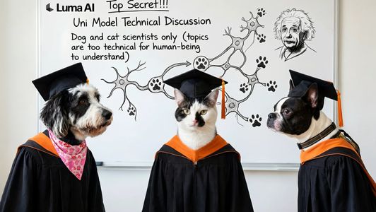 实际应用中,Uni-1可以将多张宠物照片中的动物合成到一个新场景中,例如穿上学术礼服站在写满科学图表的白板前,保留每只动物的独特特征,而无需大量手动调整或后期处理。