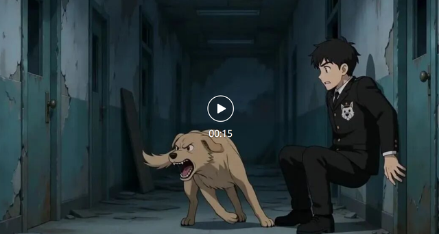 视频开始于一名身着正装的男子在废弃楼道里巡逻,他的左边有一条黄色流浪狗;随后他蹲下来给流浪狗喂食;随后镜头切换至@图片-1,流浪狗闻了闻食物,然后试图咬男子的手;随后镜头切换至@图片-2,男子受到惊吓;随后镜头切换至@图片-3,男子蹲了下来;最后镜头切换至@图片-4,男子伸手抚摸了流浪狗的头。