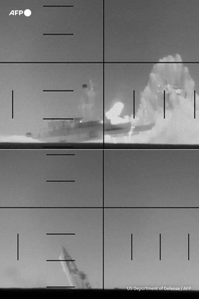 黑白影像显示了一枚鱼雷击中目标瞬间激起的巨大水柱。五角大楼发布这些画面的同时,也表明了此次攻击没有后续的救援行动。(新华社)