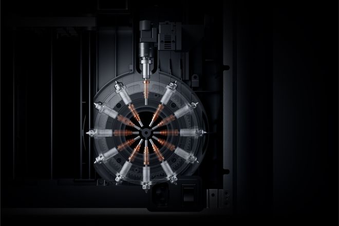 对用户而言,它意味着切换材料时,无需排空旧料、送入新料,而是直接自动切换到对应新料的洁净喷嘴。结果是:材料浪费减少 90%,切换速度提升 50%。从「等待清洗」到「即切即用」,体验的差异感,由此产生。