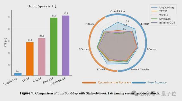 在Oxford Spires、ETH3D、Tanks & Temples等权威数据集测试中,轨迹误差降低约77%,3D点云建模精度、全局一致性远超所有流式竞品,甚至比部分离线优化模型表现更优。