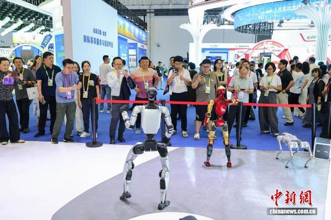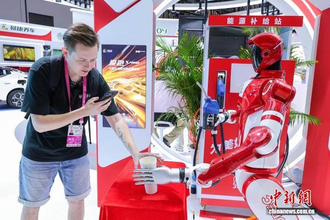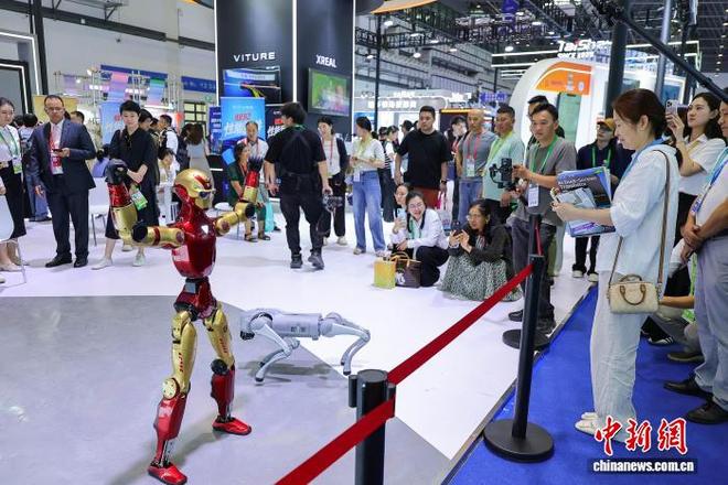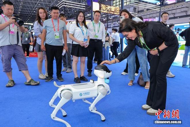 同样在同一天于海南举行的第六届中国国际消费品博览会中,展会现场展出了各式各样的智能机器人,吸引了众多参观者的关注并进行了互动活动。一个外国访客与一台展出的机器狗亲切互动,并对其功能表示出浓厚的兴趣和好奇。
