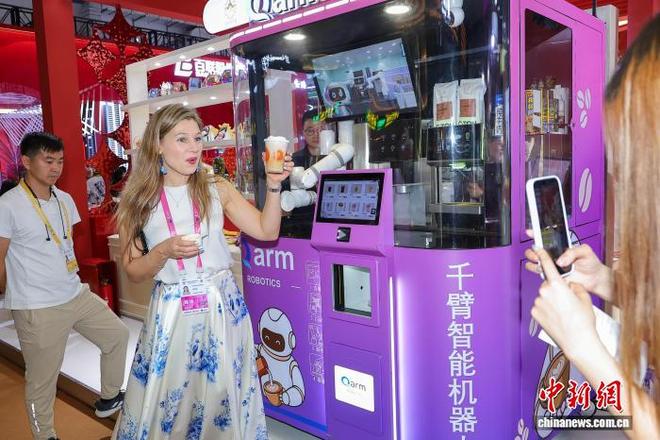 4月13日,在海南省海口市举办的第六届中国国际消费品博览会上,多款智能机器人凭借其前沿科技和独特应用吸引了很多观众的注意力,并与其进行了深入交流。一名外籍网络主播体验了由智能机器人为她制作的一杯咖啡。