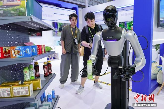 同一天举行的第六届中国国际消费品博览会于海南海口市举办。展会上众多智能机器人因其创新技术和新颖的应用形式吸引了大量参观者的注意并进行了互动体验。一位外国网络主播与一台服务型机器人进行互动交流,展示了其智能化功能。