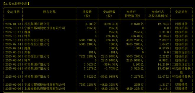 在2025年二月,杉杉集团的一致行动人宁波鄞州捷伦投资持有的4829.33万股被法院强制执行,并划转至上海海毅供应链管理有限公司名下;同时杉杉集团自身持有的3194.54万股股份也通过公开交易形式被司法处置。
