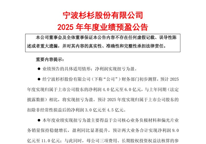 1月31日,浙江上市企业杉杉股份发布了全年财务预测报告,预计在2025年实现净利润4.0亿元至6.0亿元,与上年相比将扭转亏损局面;扣除非常项目后的净收益预计为3.0亿元至4.5亿元。