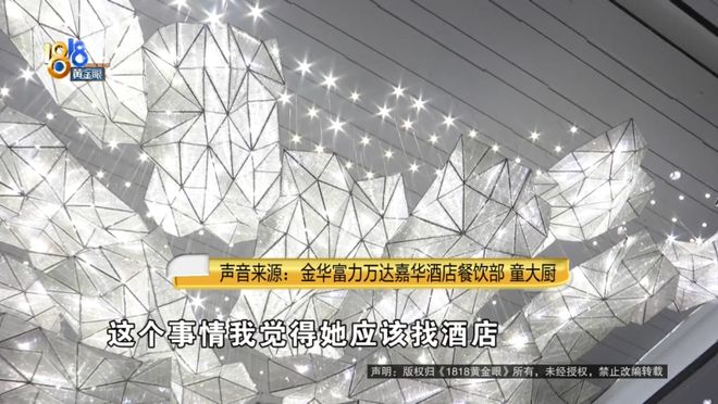 金华富力万达嘉华酒店餐饮部 童大厨:我做了二十多年厨师,没有说过婚宴烧菜都是我厨师长烧的,没有这种说法的。我们都在现场管控,不是说现场我烧,我不烧的,我管的楼层很多。刚开始是说“波龙”没肉,第二说螃蟹是死的,然后又说所有的菜让我本人烧。在我认知里,这个人有点不讲道理,这个事情我觉得她应该找酒店,你不应该找我。