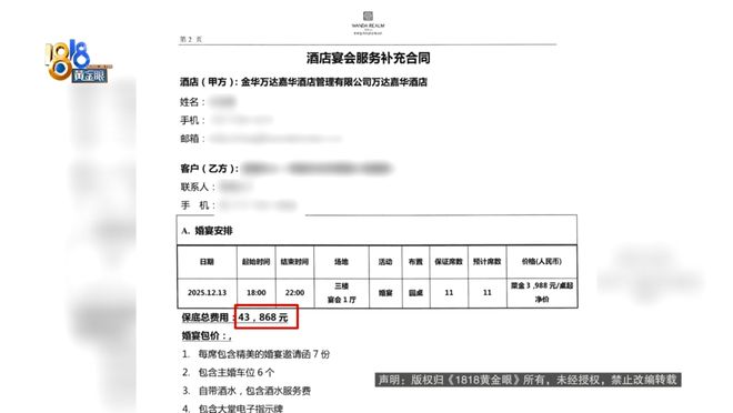 黄女士:是因为我看中了它的场地,事先过来跟主厨他们沟通了。希望我们的菜,第一个,因为是冬天,希望是热气腾腾的,第二的话食材新鲜。那第三的话,也不是说有多好吃,因为我们也知道婚宴可能众口难调,但是至少大家吃了之后,可能没什么说不好吃这种情况出现。试菜是要自己付费,那我想着就先算了,因为你这么大的酒店品牌,我觉得应该也不会太差的。