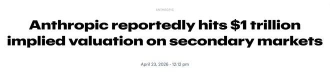 第二个:Anthropic在二级市场的隐含估值已经飙到1万亿美元。