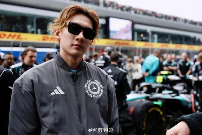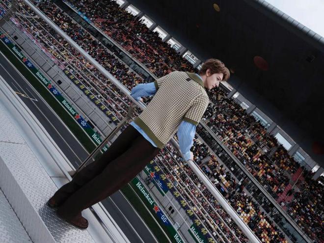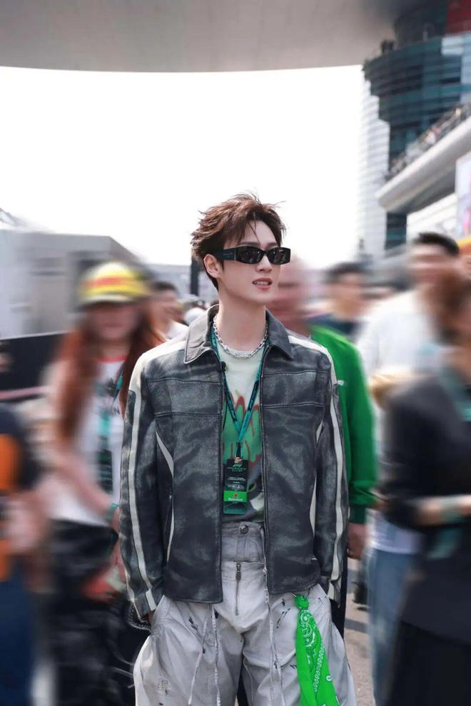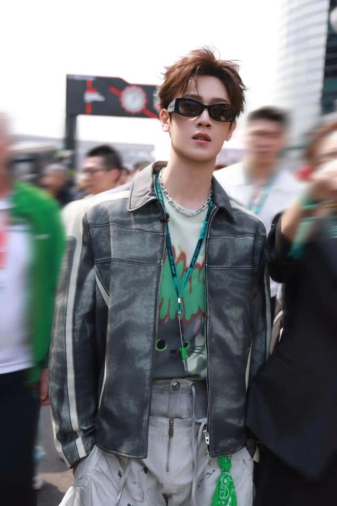 李昀锐选择了 Diesel 2026 早春系列的拼色翻领皮夹克,其做旧的质感和硬朗的触感与 F1 赛事的机械美学相呼应。