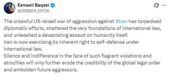 当地时间3月8日,巴加埃在新闻发布会上表示,在面对美国及以色列的非法军事行动时,伊朗正通过合法途径行使正当自卫权。