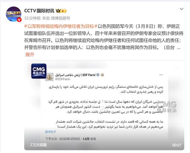 该国重申将对任何试图任命哈梅内伊继任者的人或组织采取行动。同时警告潜在参与者,以色列不会容忍任何人参与此次选举活动。