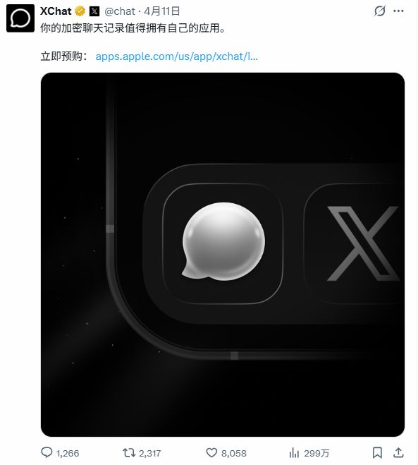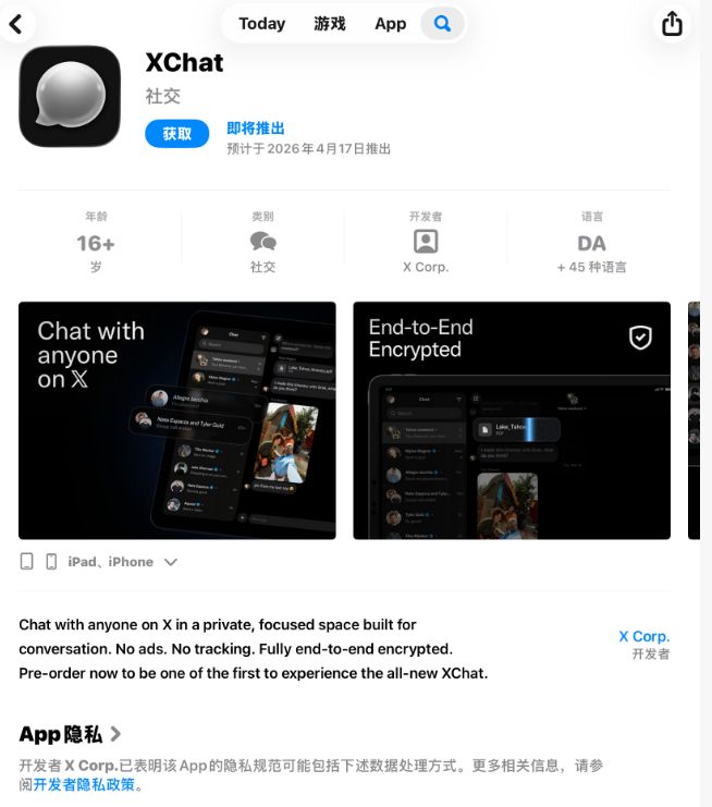另外,在App Store上展示的XChat应用目前还处于预约阶段,正式版本将在4月17日上线。在此之前,请勿下载来源不明的应用以免遭受钓鱼攻击的风险。