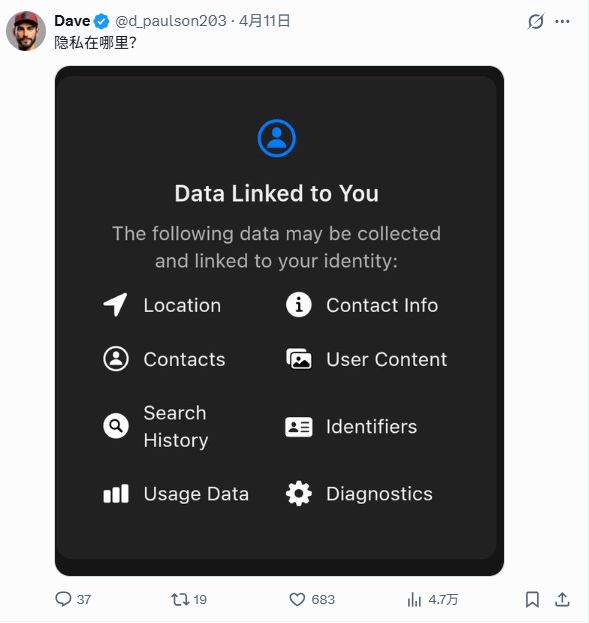 还有网友直接晒出了XChat在App Store上的隐私设置质问马斯克,既然标榜私密性,为什么还会连接到这么多私密信息。