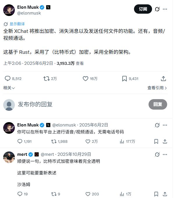 其实关于私密性这件事,早在去年5月XChat测试时,6月份马斯克发布的推文中就有人提出过质疑,当时马斯克宣称这是比特币技术加密,而评论区业内人士直言比特币加密意味着完全透明。