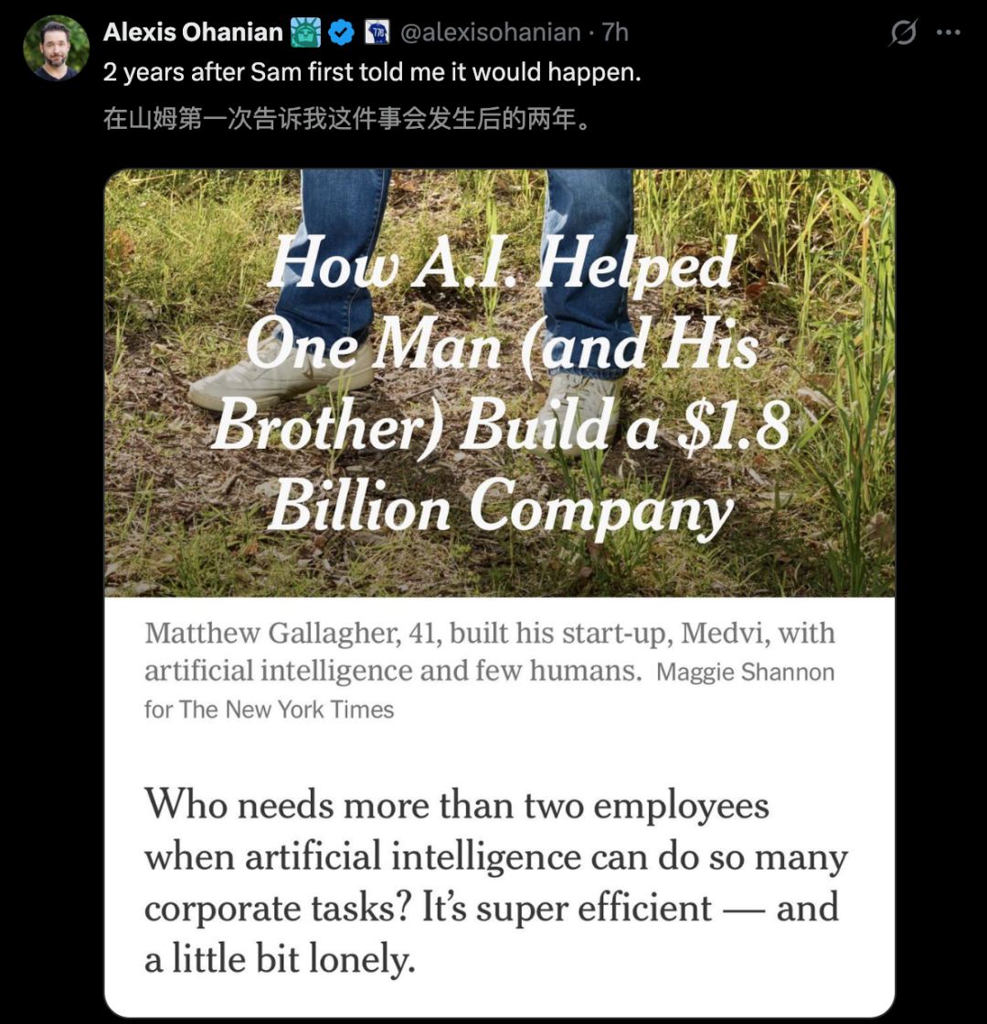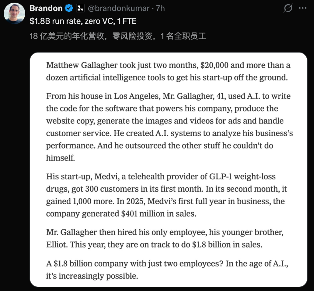 Medvi的成功案例不仅验证了奥特曼两年前提出的预言——一个人可以依靠强大的人工智能工具建立一家年收入接近二十亿美元的公司,同时也揭示了一个核心逻辑:限制公司规模的关键在于创始人的认知边界和执行速度。