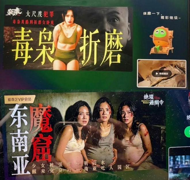 近来,社交媒体上有多名网友爆料称,在爱奇艺平台上观看剧集时遇到一些缉毒题材电视剧的宣传广告出现在暂停界面中。这些广告以“囚禁女警卧底”和“捆绑、灌药及酷刑虐待”为内容,并配以诸如“少女被强迫摄入药物”、“东南亚吃人园区”的文字,引发用户反感。