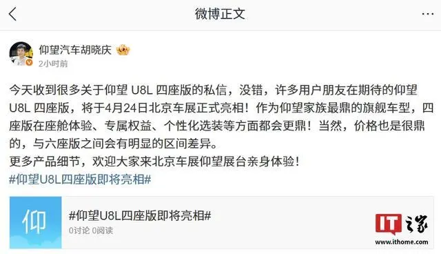 比亚迪仰望销售事业部的总经理胡晓庆在今日发布了一则公告,宣布旗下四座版车型仰望 U8L 将于 4 月 24 日在北京车展上首次展出。