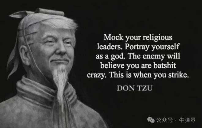 因为网上一张热传的“唐子”(Don Tzu,将特朗普和我们古代的孙子结合的网络热梗)语录就指出:嘲笑你的宗教领袖。把自己描绘成神。敌人会认为你疯了。但这是你发动袭击的时候。