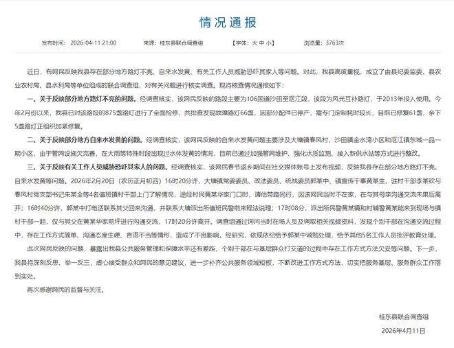 近期有网民反映该县某些地区路灯不亮、自来水水质异常以及工作人员对投诉者家属进行威胁恐吓等问题,对此当地政府高度重视,并成立了由纪检监察机构和相关部门组成的联合调查组进行全面核查。