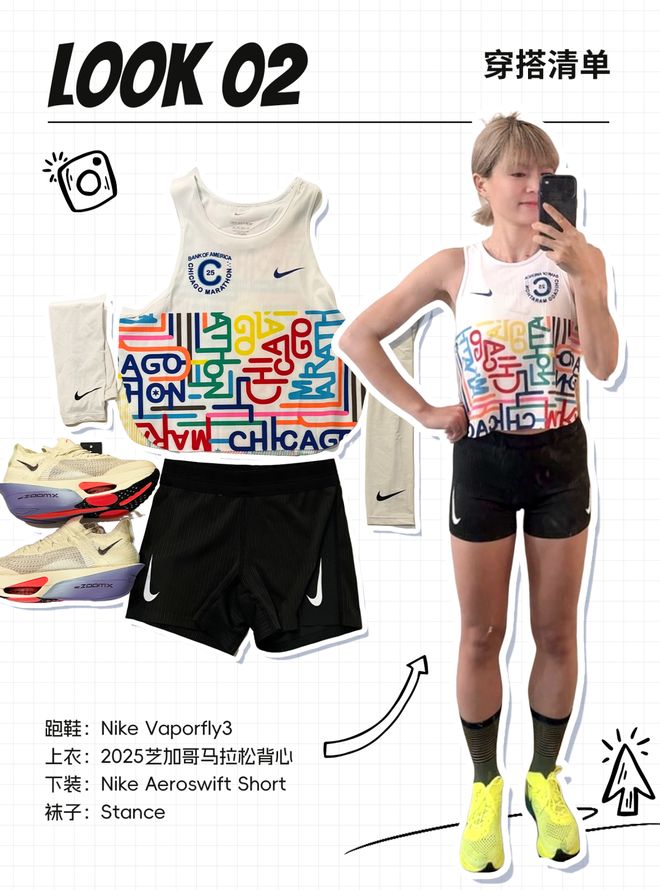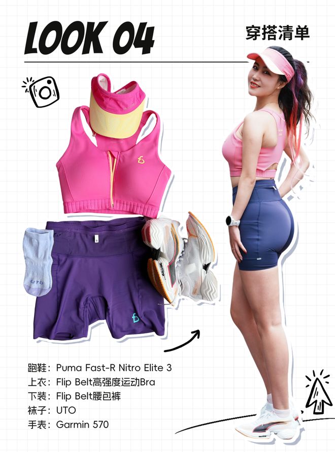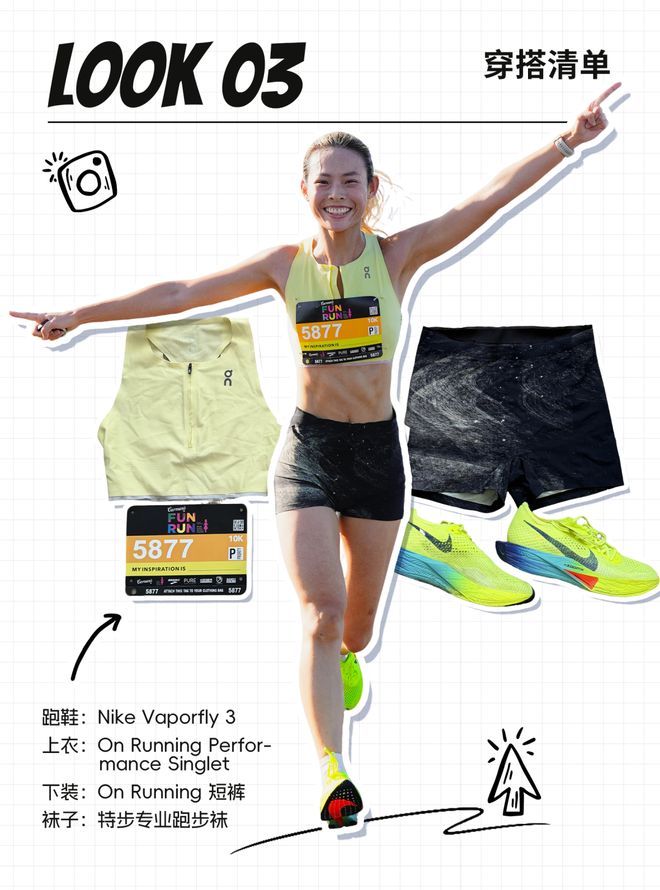 谈到跑步时的穿搭,她表示自己最大的动力就是穿上好看的装备。每当她在比赛中取得突破性进展后,她会奖励给自己一件精英级别的跑鞋——通常是那些不太容易撞衫的新款式(或者新款)。她的赛中穿着一般以背心为主,并搭配半弹材质的运动裤;袜子方面,她特别偏爱中筒长度的设计,因为这样能让腿部线条看起来更加优美。