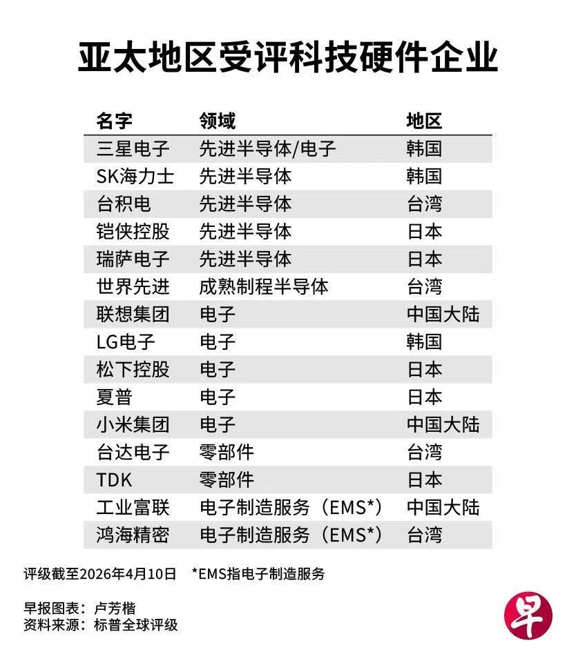 国际评级机构标普全球评级(S&P Global Ratings)于4月13日发布的一份报告指出,在需求减弱和成本上升的双重压力下,消费电子产品制造商面临严峻挑战;相比之下,由于人工智能数据中心投资强劲以及市场需求支撑,高端芯片制造商则拥有更强的价格调整能力以应对成本上涨。